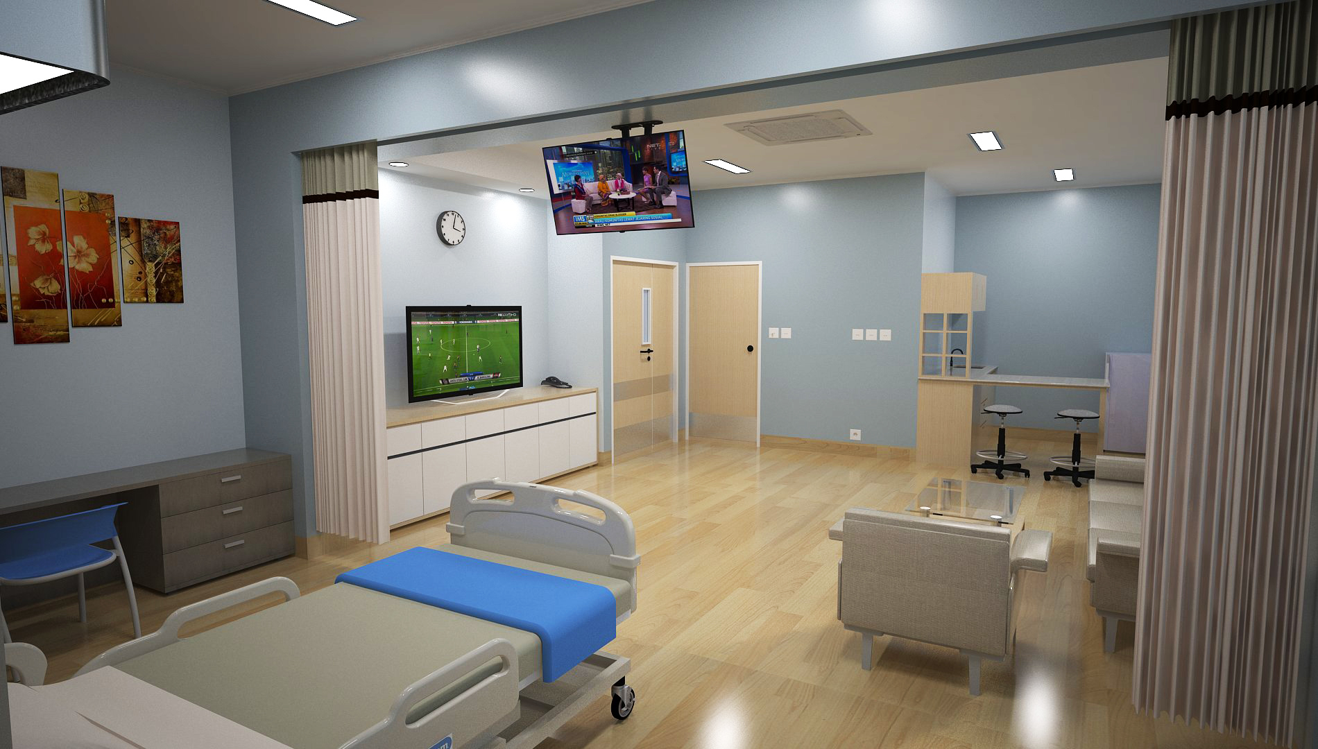 - Ruang Rawat Inap: Pemasangan backdrop dan furniture built-in yang menyesuaikan dengan kebutuhan pasien dan perawat, fokus pada kemudahan akses dan pembersihan.\